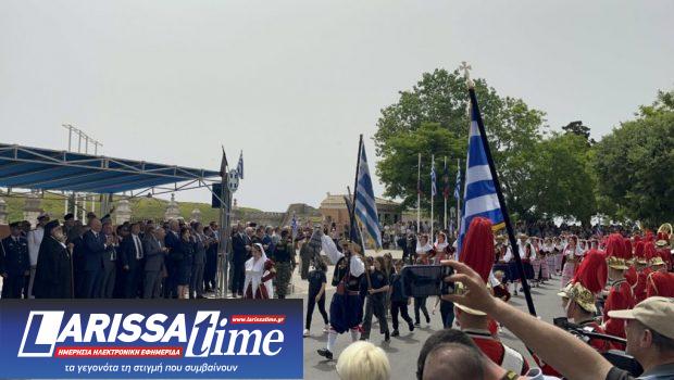 Ο επικεφαλής του τμήματος χορευτών Κέρκυρας ύψωσε με το χέρι του την παλαιστινιακή μαντίλα ενώ ταυτόχρονα, με το άλλο χέρι, κρατούσε την ελληνική σημαία.