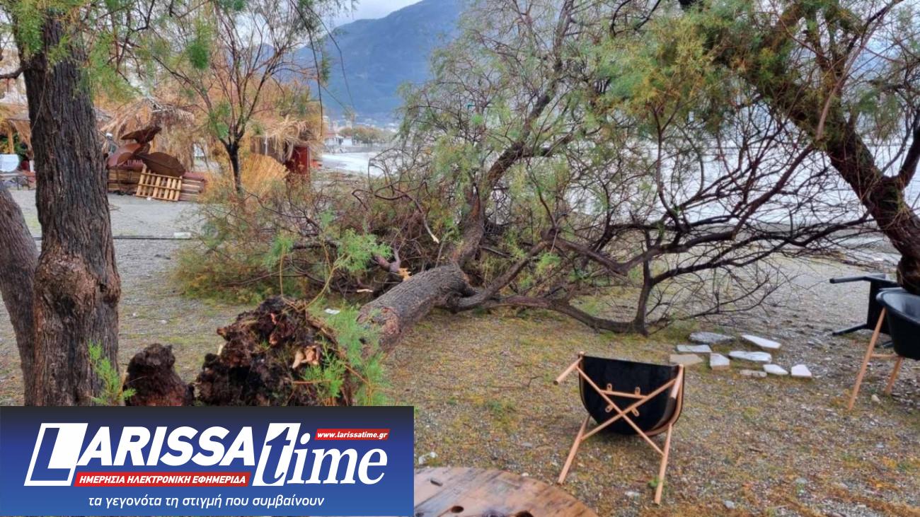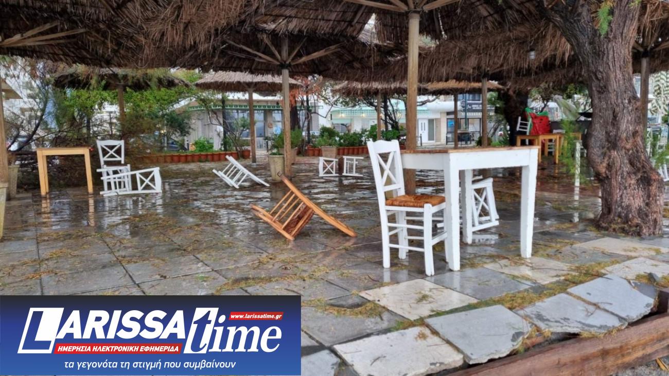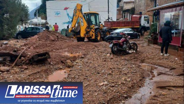 Ο παραλιακός δρόμος ξηλώθηκε από τα ορμητικά νερά και το κέντρο του χωριού γέμισε λάσπες, πέτρες και φερτά υλικά.