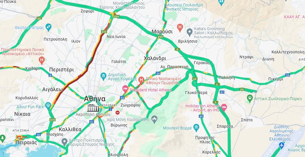 Όπως φαίνεται στον χάρτη της κίνησης ο Κηφισός έχει κοκκινίσει. Όσοι οδηγοί κινούνται εκεί έχουν χαμηλώσει ταχύτητες, ενώ και στους γύρω δρόμους καταγράφεται αυξημένη κυκλοφορία.