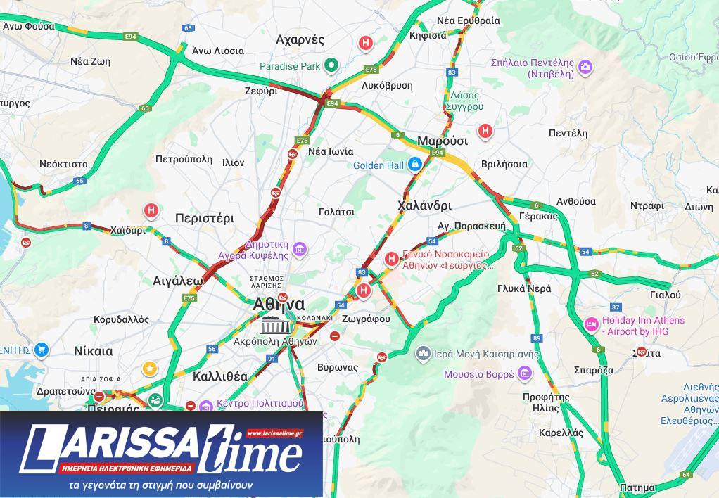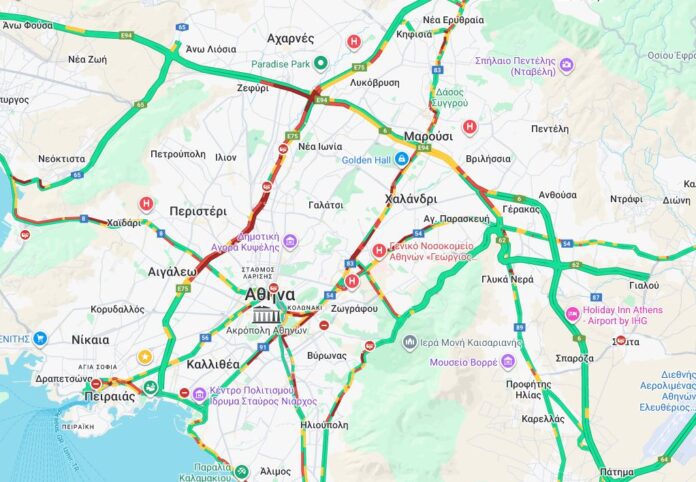 Συγκεκριμένα, μποτιλιαρισμένη είναι τόσο η άνοδος όσο και η κάθοδος του Κηφισού, ενώ η ίδια εικόνα επικρατεί και στα 2 ρεύματα κυκλοφορίας στη λεωφόρο Κηφισίας.