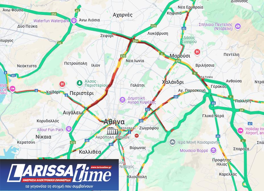 Κεντρικοί άξονες όπως η λεωφόρος Κηφισού και στα δύο ρεύματα, η Αττική Οδός βρίσκονται στο «κόκκινο» σε αρκετά σημεία.