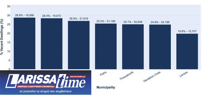 Ειδικότερα στη Λάρισα ο αριθμός των κενών κατοικιών ανέρχεται σε 15.707 (ποσοστό 19,8%).