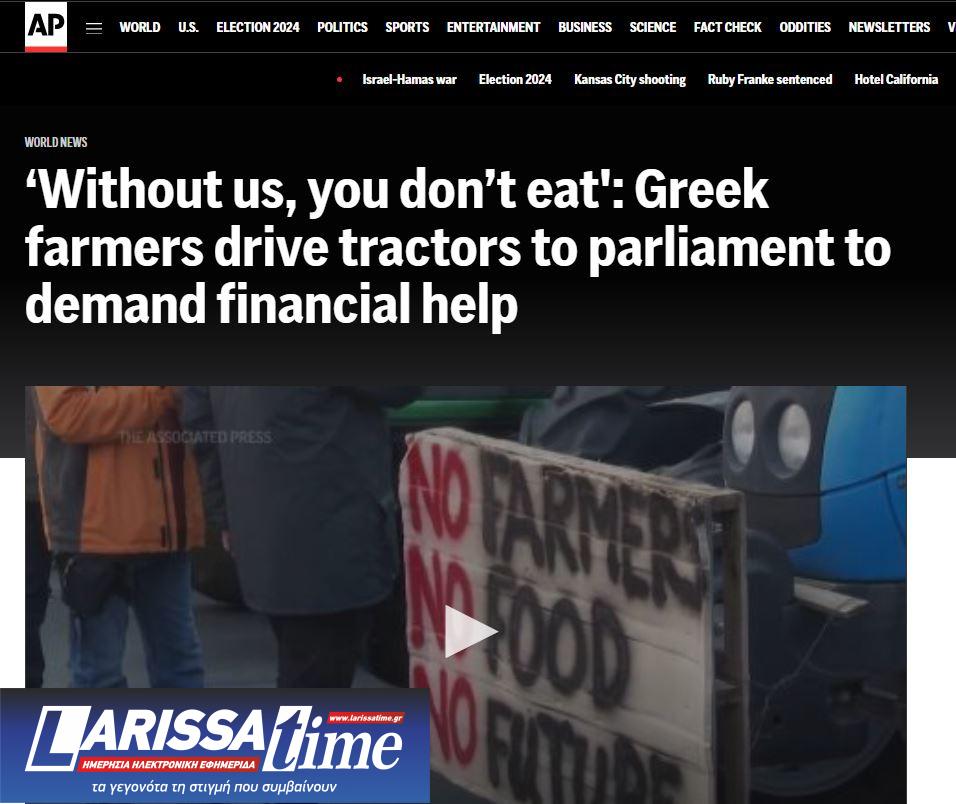 Το μεγάλο αμερικανικό ειδησεογραφικό πρακτοτείο Assosciated Press μεταδίδει πως «δεκάδες τρακτέρ σε έντονα χρώματα ήταν σταθμευμένα έξω από το ελληνικό κοινοβούλιο την Τρίτη, με τις κόρνες να ηχούν, καθώς χιλιάδες αγρότες οργισμένοι από το υψηλό κόστος παραγωγής μετέφεραν τις διαμαρτυρίες τους στην Αθήνα».