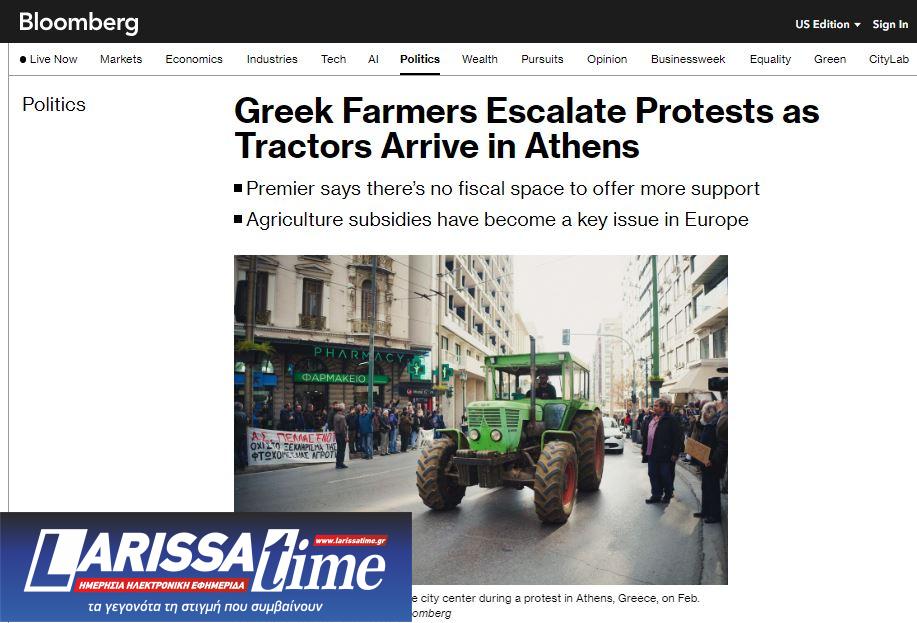 Το αμερικανικό Bloomberg δημοσιεύει επίσης το συλλαλητήριο των αγροτών με τα τρακτέρ στο Σύνταγμα, τονίζοντας πως «οι Έλληνες αγρότες κλιμακώνουν τις διαμαρτυρίες τους, οδηγώντας τα τρακτέρ τους στην Αθήνα, αφού ο πρωθυπουργός Κυριάκος Μητσοτάκης δήλωσε ότι δεν υπάρχει δημοσιονομικός χώρος για να προσφέρει περαιτέρω οικονομική ελάφρυνση».