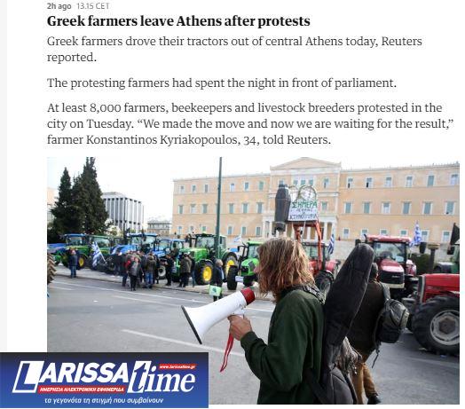 «Οι Έλληνες αγρότες έβγαλαν σήμερα τα τρακτέρ τους από το κέντρο της Αθήνας», γράφει ο βρετανικός The Guardian, καλύπτοντας το θέμα στη ζωντανή (live) σύνδεσή του.