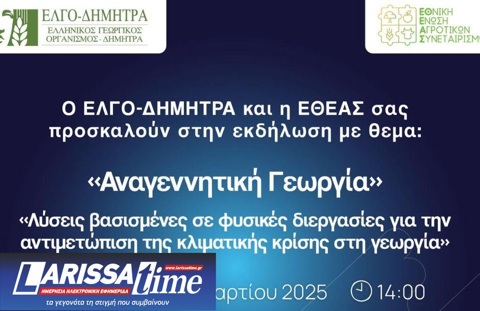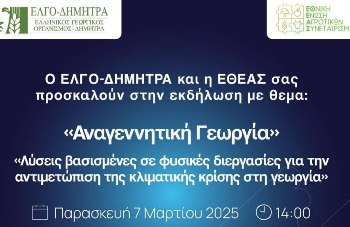 Κοινή εκδήλωση με θέμα την «Αναγεννητική Γεωργία» θα πραγματοποιήσουν στα πλαίσια της Agrothessaly στη Λάρισα την Παρασκευή 7 Μαρτίου η ΕΘΕΑΣ και ο ΕΛΓΟ-Δήμητρα.