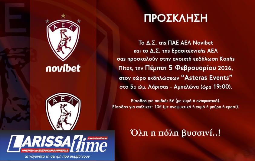 Το Δ.Σ. της ΠΑΕ ΑΕΛ Novibet και το Δ.Σ. της Ερασιτεχνικής ΑΕΛ σας προσκαλούν στην ανοιχτή εκδήλωση Κοπής Πίτας, την Πέμπτη 5 Φεβρουαρίου 2026, στον χώρο εκδηλώσεων “Asteras Events” στο 5ο χλμ. Λάρισας – Αμπελώνα (ώρα 19:00).