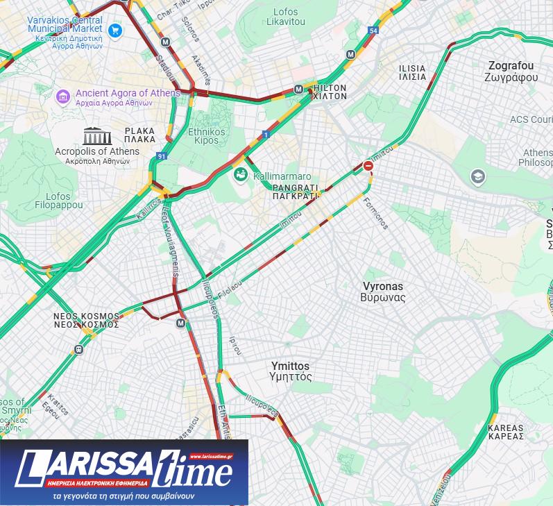 Με προβλήματα διεξάγεται η κυκλοφορία και επί της λεωφόρου Β. Σοφίας στο ρεύμα προς Αθήνα, από το ύψος του Χίλτον, ενώ στο κόκκινο βρίσκεται και η Σταδίου στο ρεύμα προς Αθήνα.