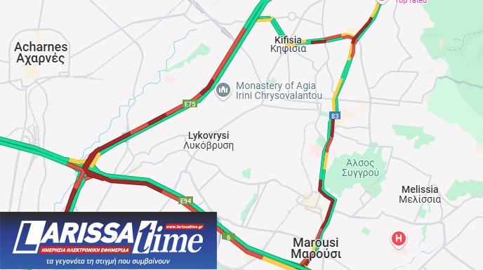 Οι οδηγοί κινούνται με πολύ χαμηλές ταχύτητες και στα δύο ρεύματα επί της λεωφόρου Κηφισίας, με την κίνηση στο ρεύμα προς Αθήνα να ξεκινά από το «Δαχτυλίδι» και να καταλήγει στο ύψος του Avenue, ενώ στο ανοδικό ρεύμα, από το ύψος Χαλανδρίου.