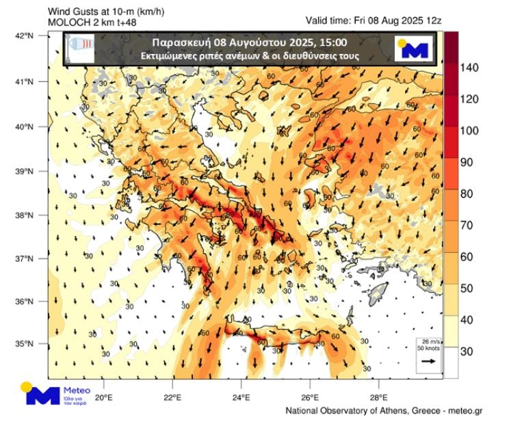 Σύμφωνα με τα διαθέσιμα προγνωστικά στοιχεία, την Παρασκευή 08/08 αναμένεται περαιτέρω ενίσχυση των βορείων ανέμων, με τις ριπές τους σε Ανατολική Στερεά, Νότια Εύβοια, Κυκλάδες και τοπικά στη Νότια Κρήτη να φτάνουν τα 100 km/h