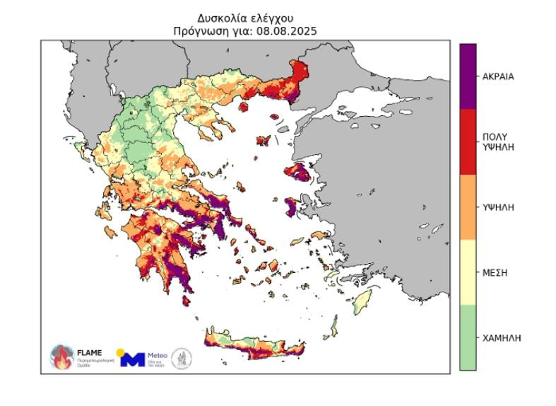Παράλληλα επισημαίνουν τη δυσκολία ελέγχου τυχόν σύμφωνα με το Καναδικό Σύστημα Πυρομετεωρολογικών Δεικτών (Canadian Forest Fire Weather Index System – CFFWIS), προσαρμοσμένο στο πυρικό περιβάλλον της Ελλάδας κατά τη διάρκεια της Πέμπτης 07/08 και Παρασκευής 08/08/2025.