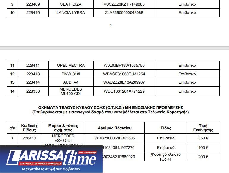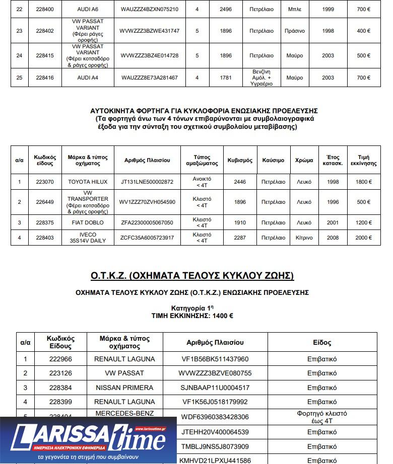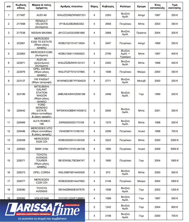 Σύμφωνα με τη σχετική διακήρυξη η τιμή εκκίνησης είναι στα 200 ευρώ, ενώ οι ενδιαφερόμενοι θα έχουν τη δυνατότητα επίσκεψης των Ι.Χ τρεις ημέρες πριν τη δημοπρασία εκτός Σαββάτου και Κυριακής και τις ώρες 9 π.μ. έως 13:30 μ.μ.
