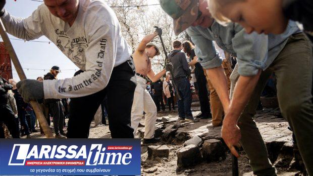 Κάτοικοι της Christiania σκάβουν τα σοκάκια στην οδό Pusher, στην Κοπεγχάγη (Πηγή: Ritzau Scanpix/Ida Marie Odgaard μέσω REUTERS)