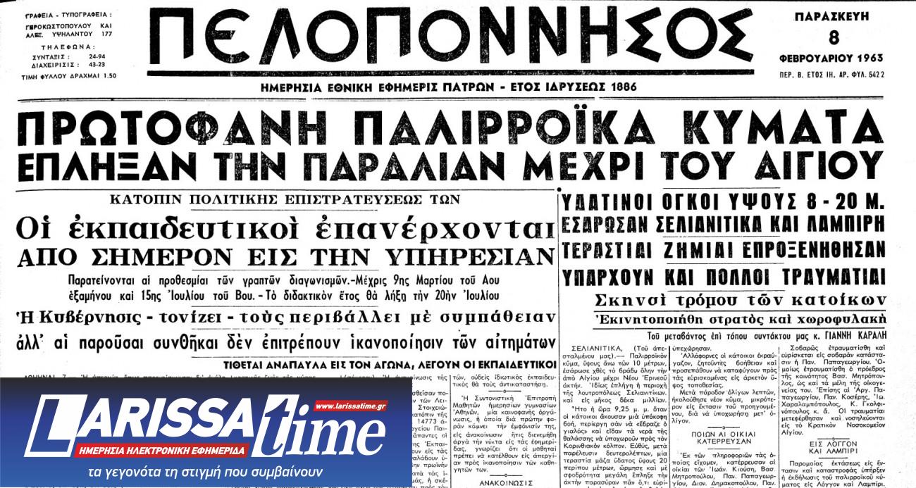 Ήταν 7 Φεβρουαρίου του 1963 όταν τα φονικά παλιρροϊκά κύματα που δημιουργήθηκαν στον Κορινθιακό έφτασαν τα 20 μέτρα – σύμφωνα με μαρτυρίες – και έπληξαν παραλιακές περιοχές της Αιγιαλείας, στην Αχαΐα, τη Δωρίδα και τη Φωκίδα προκαλώντας εκτεταμένες ζημιές.