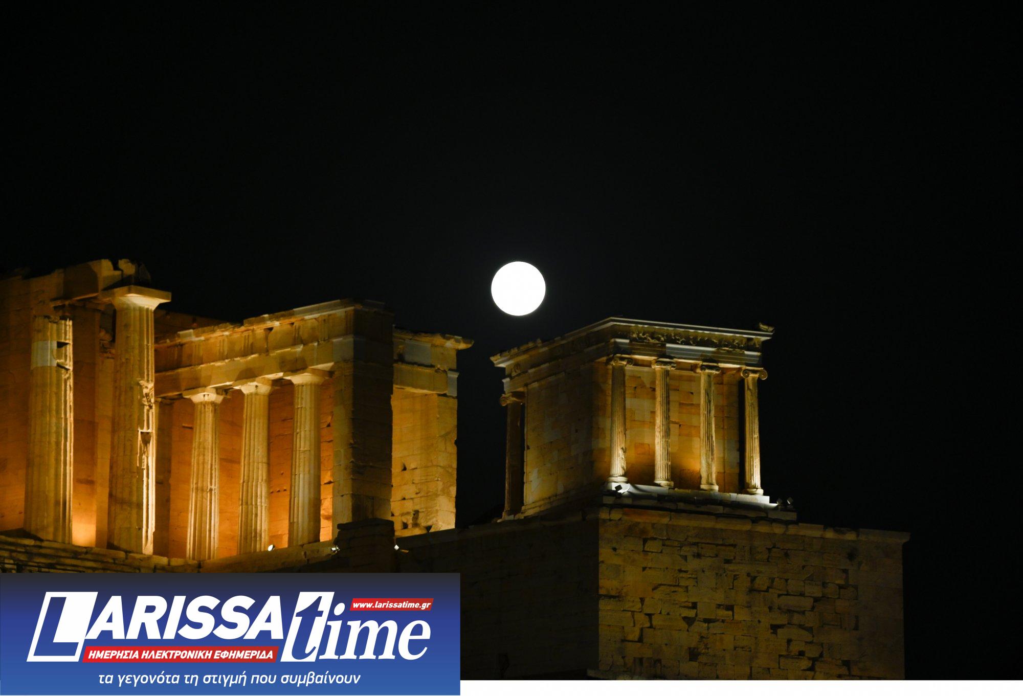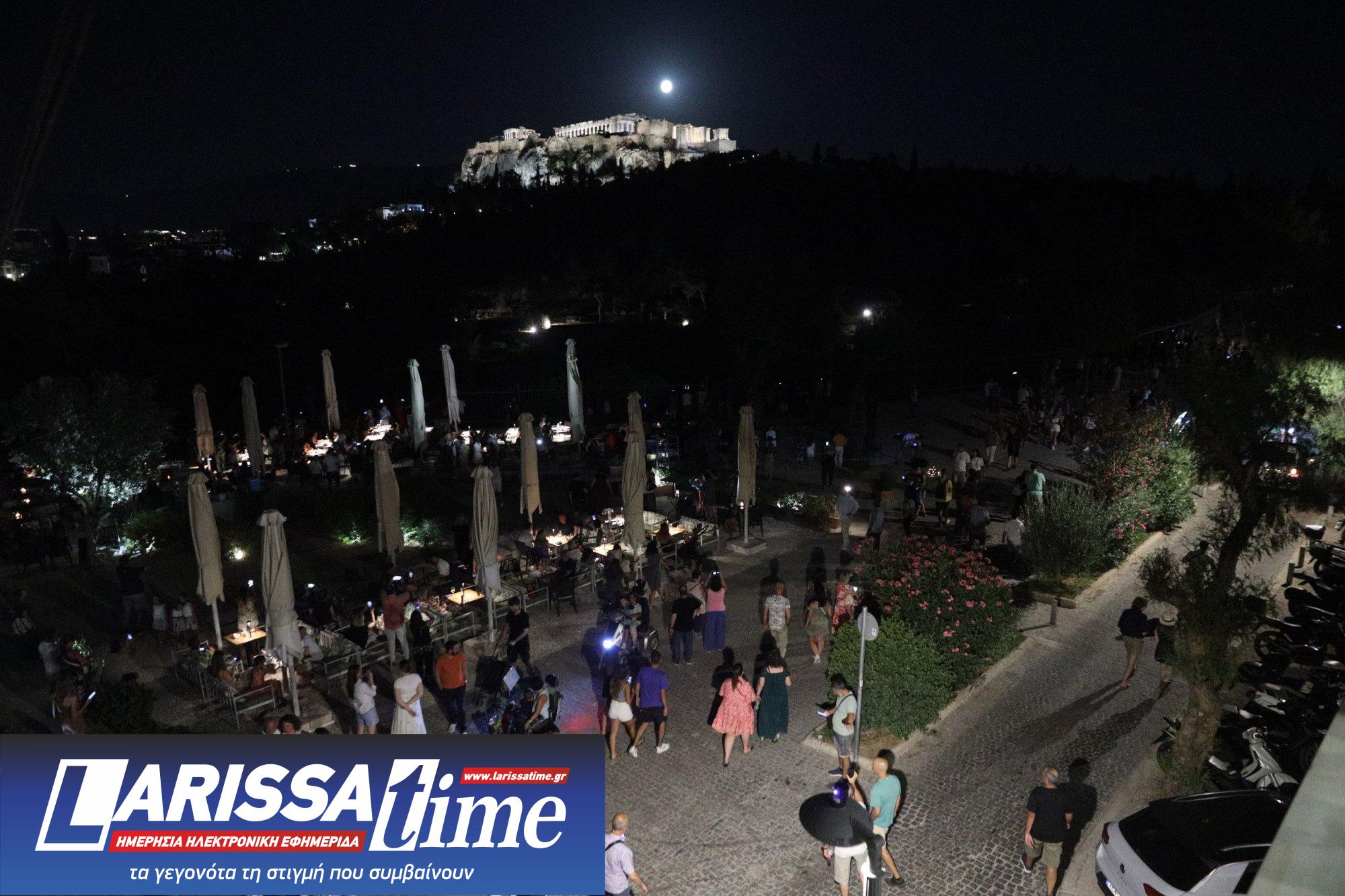 Τόσο οι ντόπιοι όσο και οι τουρίστες έχουν βγει για έναν περίπατο στο ιστορικό κέντρο της Αθήνας με το φως της πανσελήνου.