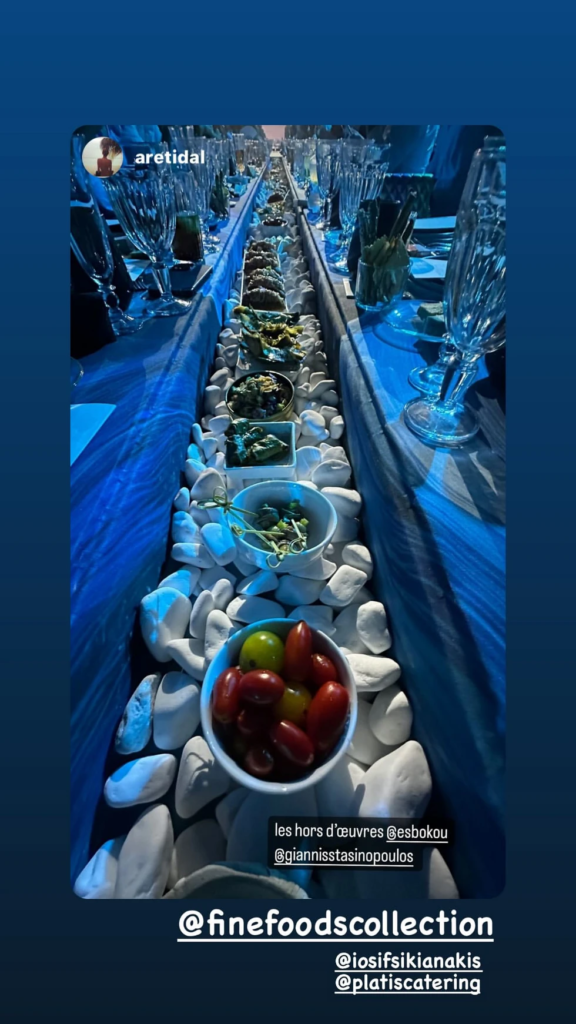 Το όλο σκηνικό θύμιζε σκηνή από κινηματογραφική ταινία. Το μενού ήταν ιδιαίτερο και το art de la table ήταν φαντασμαγορικό.
