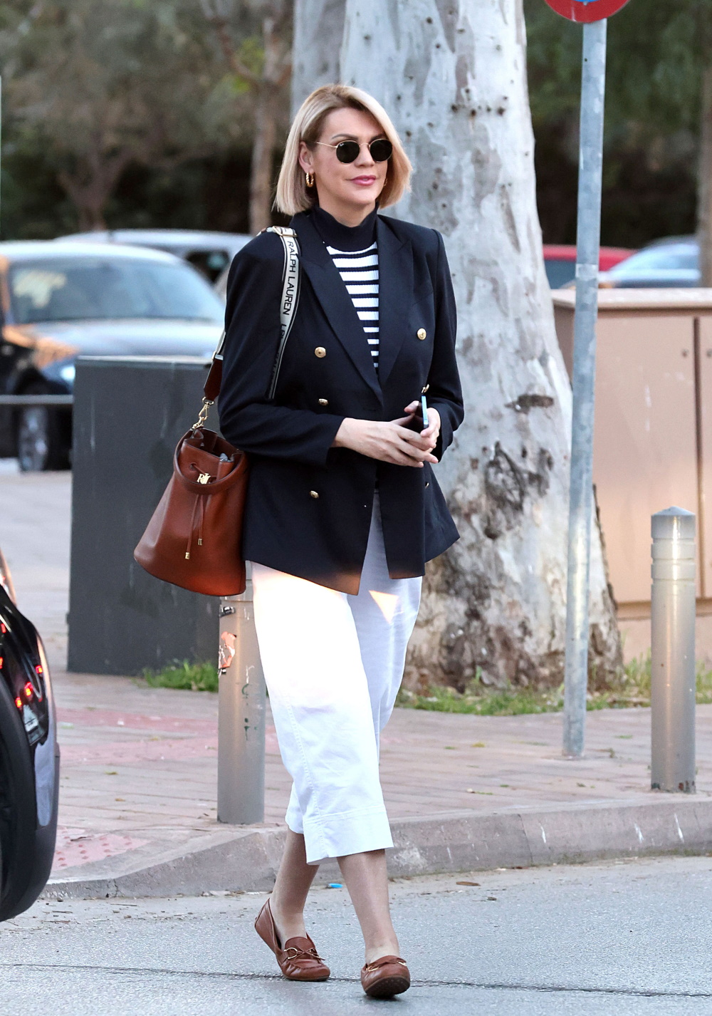 Η Σάσα Σταμάτη ολοκλήρωσε το navy σύνολο με καφέ τσάντα πουγκί, Ralph Lauren και boat shoes.