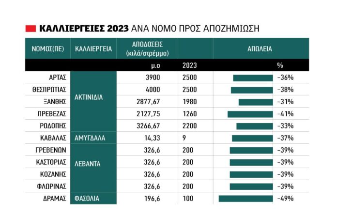 Συγκεκριμένα, με κοινή Υπουργική Απόφαση, που δημοσιεύθηκε στο ΦΕΚ (Β’ 7305), ανατίθεται στον ΕΛ.Γ.Α. η υλοποίηση μέτρων κρατικών οικονομικών ενισχύσεων υπέρ των παραγωγών της χώρας που οι εκμεταλλεύσεις τους οι οποίες περιλαμβάνουν καλλιέργειες ακτινιδίων, αμυγδάλων, λεβάντας και φασολιών, ζημιώθηκαν από θεομηνίες (ανεμοστρόβιλοι, κατολισθήσεις, πλημμύρες) και δυσμενείς καιρικές συνθήκες (παγετούς, χαλάζι, ανεμοθύελλες, σφοδρές βροχοπτώσεις, υψηλές θερμοκρασίες, διακυμάνσεις θερμοκρασίας, χιονοπτώσεις και έντονη ξηρασία) κατά τη χρονική περίοδο Ιανουάριος Δεκέμβριος 2023.