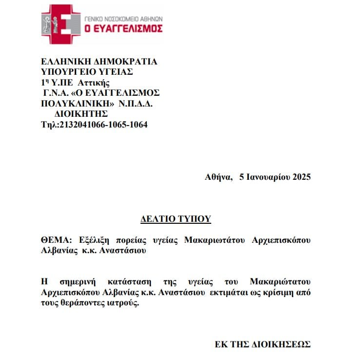 Κρίσιμη εκτιμάται η κατάσταση της υγείας του Μακαριωτάτου Αρχιεπισκόπου Αλβανίας Αναστάσιου από τους θεράποντες γιατρούς, σύμφωνα με νέο ιατρικό ανακοινωθέν του νοσοκομείου «Ευαγγελισμός».