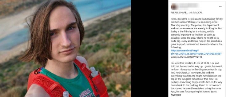 Η αδελφή του Γιόχαν, Τερέζα, προχώρησε σε μία ανάρτηση απευθύνοντας έκκληση σε όλους όσοι γνωρίζουν την περιοχή όπου εξαφανίστηκε ο 21χρονος να βοηθήσουν και να έρθουν σε επικοινωνία με τις αρχές.