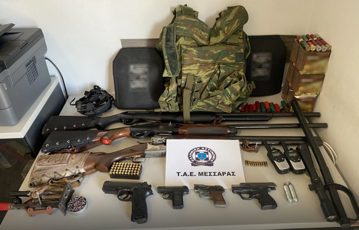 Η σύλληψη της γυναίκας έγινε στη διάρκεια έρευνας στην οικία του άνδρα που αναζητείται, έπειτα από πληροφορίες που είχαν περιέλθει στις αστυνομικές αρχές για τη δράση του ημεδαπού. Στη διάρκεια των ερευνών βρέθηκαν και κατασχέθηκαν συγκεκριμένα τέσσερα πιστόλια διαφόρων τύπων, τρία κυνηγετικά όπλα, 992 πλήρη φυσίγγια διαφόρων τύπων και διαμετρημάτων, ένας γεμιστήρας, στρατιωτικό αλεξίσφαιρο βαρέως τύπου, διόπτρα για τυφέκιο, εξάρτημα κράνους για οπτικά μέσα, δύο φορητοί ασύρματοι, αστυνομική ράβδος, πέντε συσκευασίες με μεταλλικά σφαιρίδια αεροβόλου όπλου , αμπούλες αερίου αεροβόλου όπλου και εξαρτήματα αναγόμωσης φυσιγγίων.