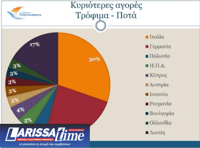 Για τον κλάδο των Τροφίμων & Ποτών, τους κυριότερους αγοραστές αποτελούν η Ιταλία, με τις εξαγωγές να φτάνουν τα 92 εκ. ευρώ, η Γερμανία με 72 εκ. ευρώ, η Πολωνία με 14,5 εκ. ευρώ, οι Η.Π.Α. 14,4 εκ. ευρώ και στην πέμπτη θέση η Κύπρος με 13,1 εκ. ευρώ.