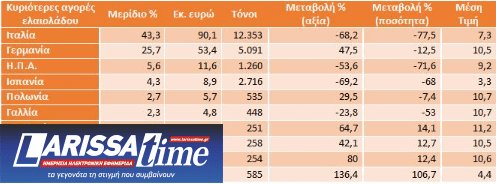 Στις αγορές του κρητικού ελαιόλαδου πρώτη έρχεται η Ιταλία με 90,1 εκ. ευρώ, δεύτερη η Γερμανία με 53,4 εκ. ευρώ και ακολουθούν οι Η.Π.Α., η Ισπανία και η Πολωνία.