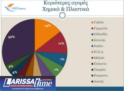 Για τον κλάδο των Χημικών & Πλαστικών, οι κυριότεροι αγοραστές είναι η Γαλλία με 19,4 εκ. ευρώ, η Γερμανία με 15,4 εκ. ευρώ, η Ολλανδία με 9,2 εκ. ευρώ, η Ισπανία με 8,9 εκ. ευρώ και η Ιταλία με 8,3 εκ. ευρώ.