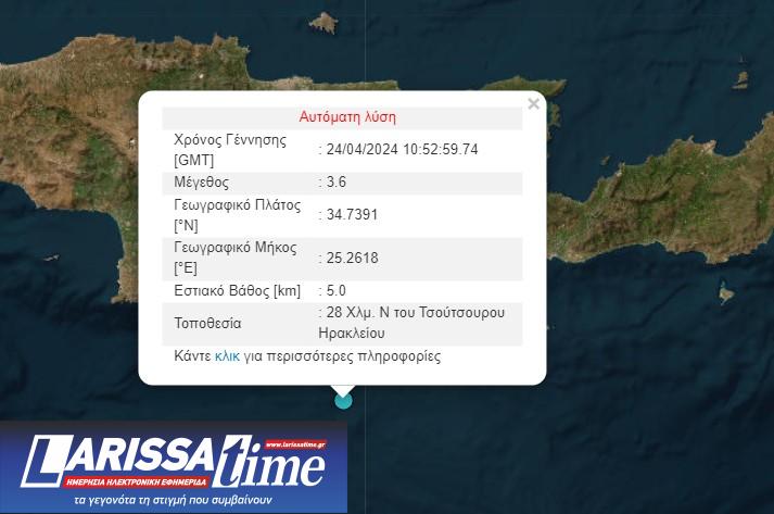 Σεισμική δόνηση μεγέθους 3.6 της κλίμακας Ρίχτερ σημειώθηκε λίγο πριν από τις 2 το μεσημέρι νότια του Ηρακλείου.