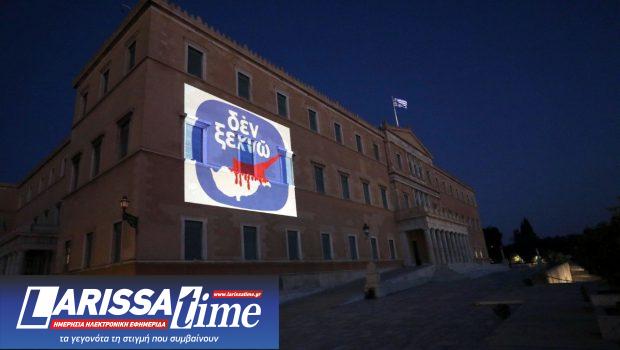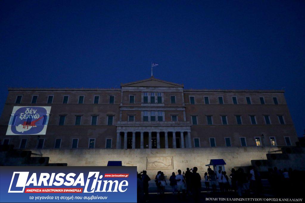 Η Βουλή των Ελλήνων φωταγωγήθηκε με το «Δεν Ξεχνώ» που εικονοποιεί την τραγωδία της Κύπρου.