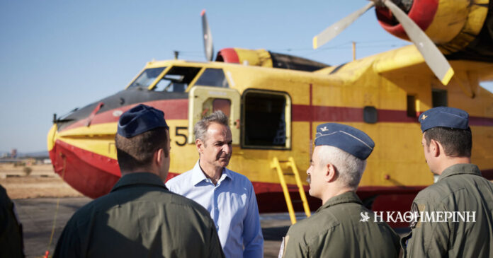Ο κ. Μητσοτάκης, συνοδευόμενος από τον αρχηγό ΓΕΕΘΑ και τον αρχηγό ΓΕΑ, ενημερώθηκε για τις αποστολές των πυροσβεστικών αεροσκαφών Canadair CL-215 και CL-415 που συμβάλλουν στο έργο κατάσβεσης των πυρκαγιών. Στη συνέχεια, επισκέφθηκε και τη Μοίρα Συντήρησης Αεροσκαφών, όπου συνομίλησε με τους τεχνικούς που συντηρούν τα αεροσκάφη καθ’ όλη τη διάρκεια του 24ωρου.