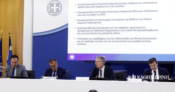 Εγινε λόγος για καθιέρωση μιας νέας κουλτούρας στα γήπεδα, παρουσιάστηκαν στοιχεία από την εφαρμογή του νομοθετικού πλαισίου, από τον Φεβρουάριο του 2024 έως τώρα, ενώ παράλληλα ο κ. Βρούτσης απαρίθμησε δέκα νέες πρωτοβουλίες που θα ληφθούν το προσεχές διάστημα, μεταξύ των οποίων και η καθιέρωση διοικητικών κυρώσεων για υποκίνηση βίας εις βάρος παραγόντων.