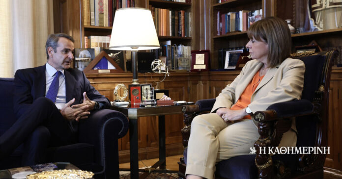 Λίγο μετά τις 12 το μεσημέρι ο πρωθυπουργός πέρασε το κατώφλι του Προεδρικού Μεγάρου και είχε σύντομη συνομιλία μπροστά στις κάμερες με την Πρόεδρο της Δημοκρατίας όπου επικεντρώθηκε στις εξαγγελίες στη Διεθνή Εκθεση Θεσσαλονίκης, δηλαδή στο «Σπίτι μου 2» και τα απογευματινά χειρουργεία, στο χαρτοφυλάκιο που ανέλαβε ο Ελληνας επίτροπος Απόστολος Τζιτζικώστας, καθώς και στην έκθεση του Μάριο Ντράγκι.