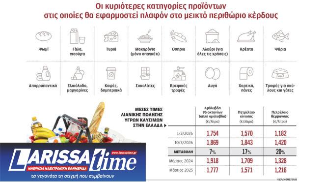 Την πρώτη γραμμή άμυνας της κυβέρνησης έναντι της ανόδου των τιμών, λόγω του πολέμου, ανακοίνωσε χθες ο πρωθυπουργός Κυριάκος Μητσοτάκης κατά τη συνάντησή του με τον Πρόεδρο της Δημοκρατίας Κωνσταντίνο Τασούλα. Συγκεκριμένα, ο κ. Μητσοτάκης ανέφερε ότι μπαίνει πλαφόν στο περιθώριο κέρδους σε καύσιμα και προϊόντα σούπερ μάρκετ με ορίζοντα τριμήνου, ανακοινώνοντας την πρώτη αντίδραση.