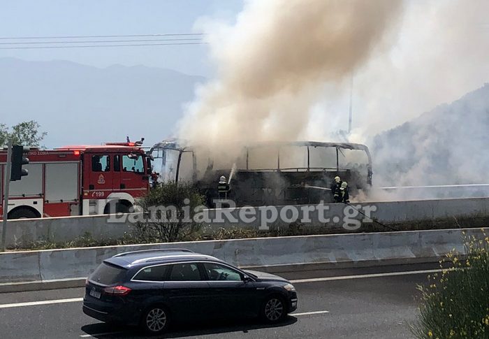 Ολοσχερώς καταστράφηκε τουριστικό λεωφορείο που παραδόθηκε στις φλόγες κοντά στο τούνελ της ΠΑΘΕ πάνω από την Στυλίδα, στην Λαμία.