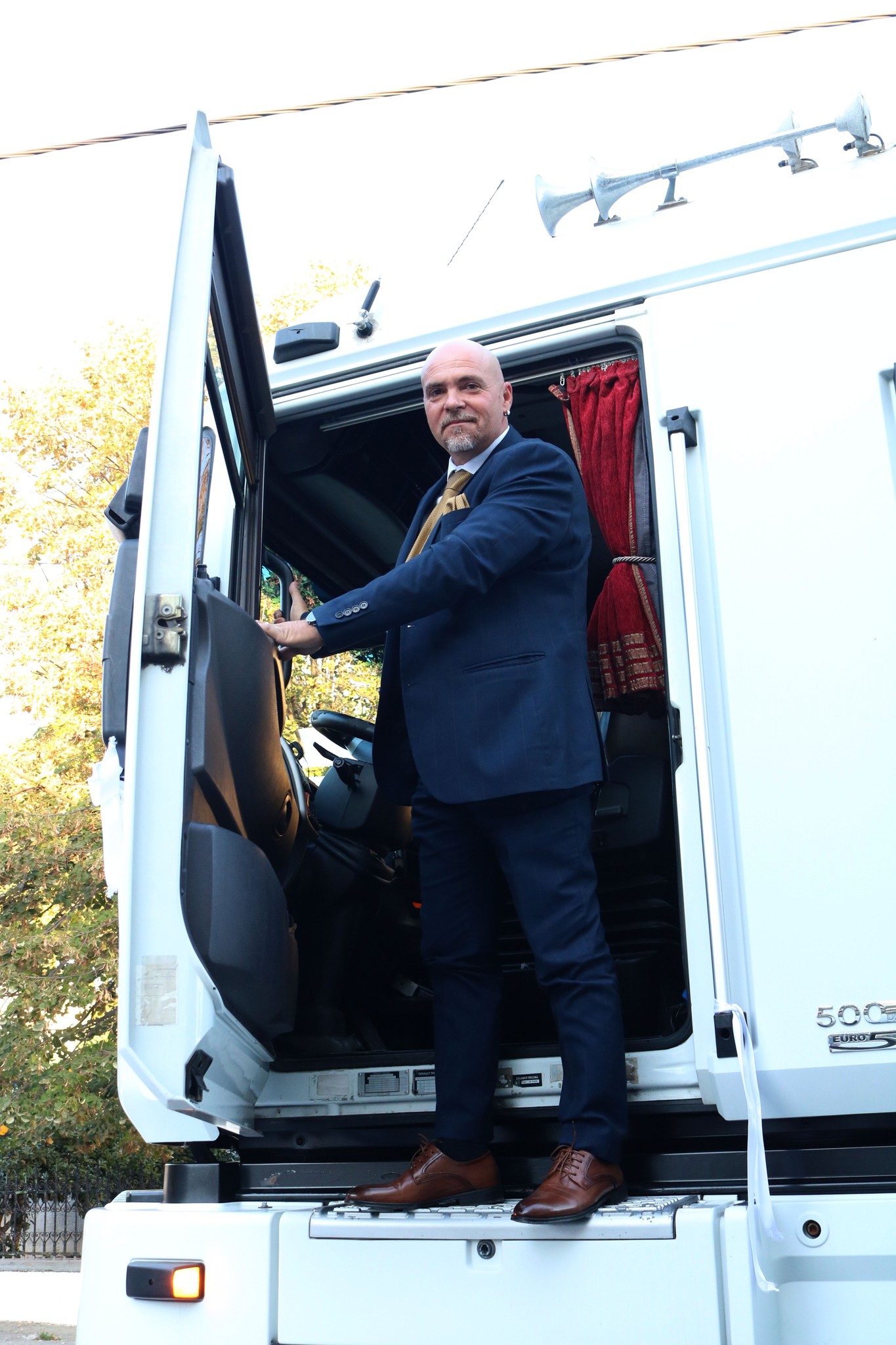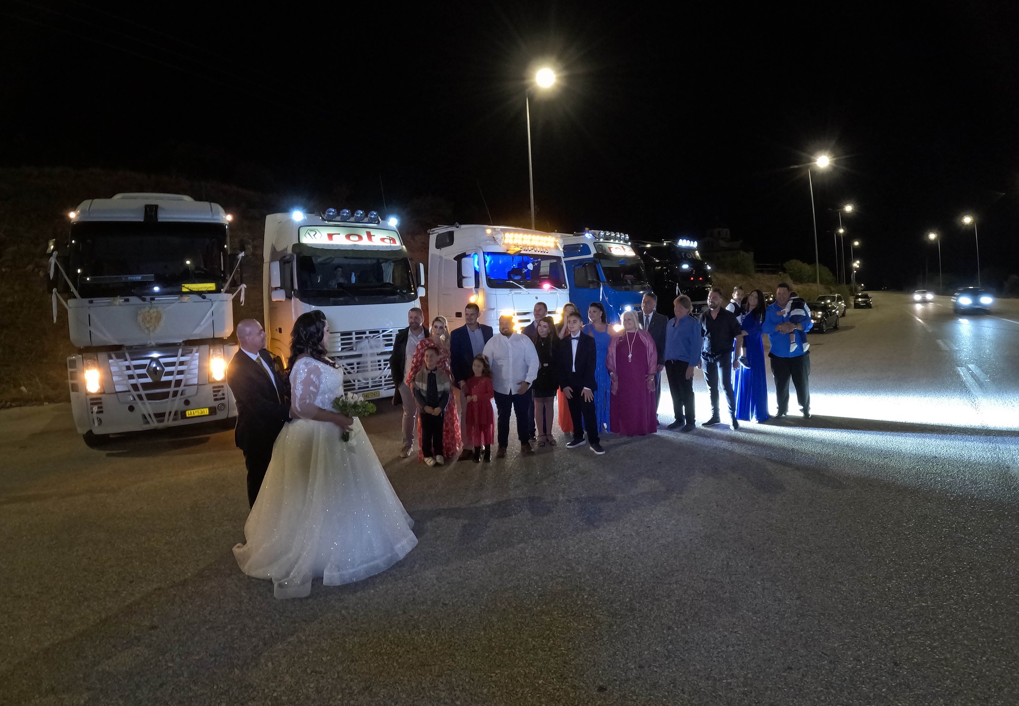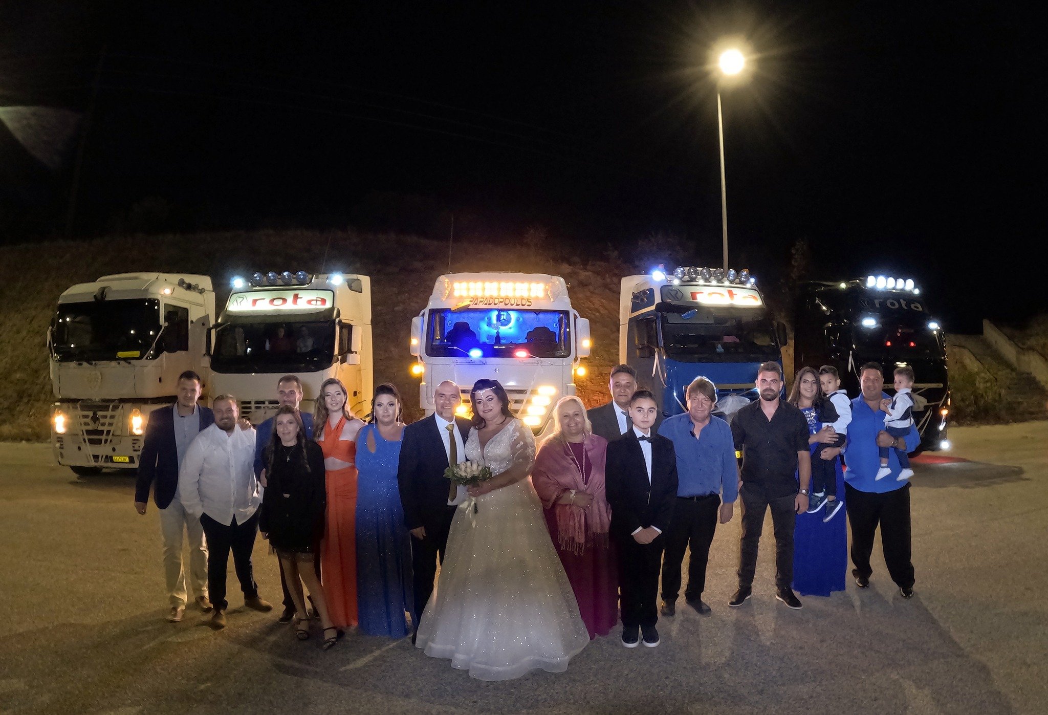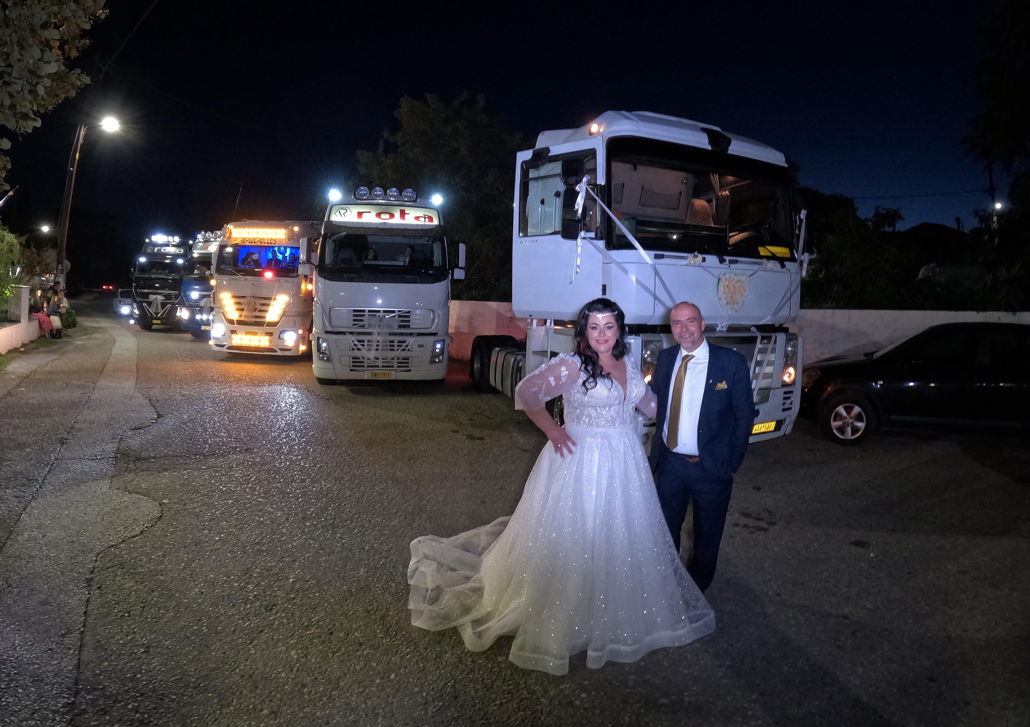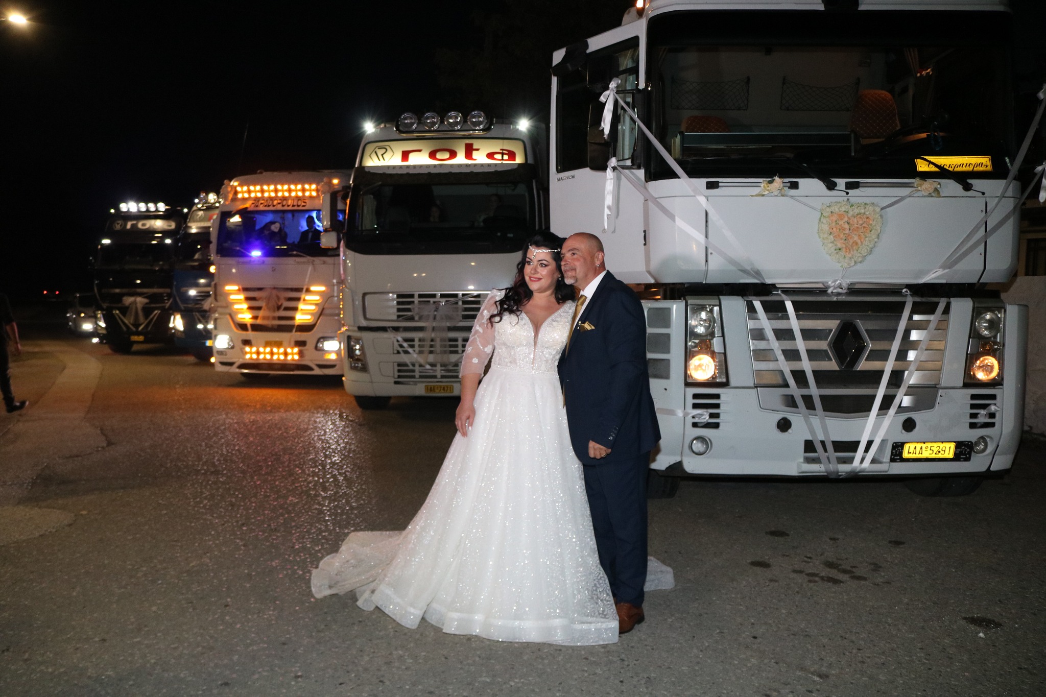 Οι συνάδελφοι του γαμπρού τα είχαν κανονίσει όλα άψογα, στολίζοντας τα φορτηγά τους για να συνοδεύσουν το ζευγάρι. Την πιο ευτυχισμένη ημέρα της ζωής τους οι τράκτορες έδωσαν έναν ευχάριστο τόνο, με τις κόρνες στη διαπασών.