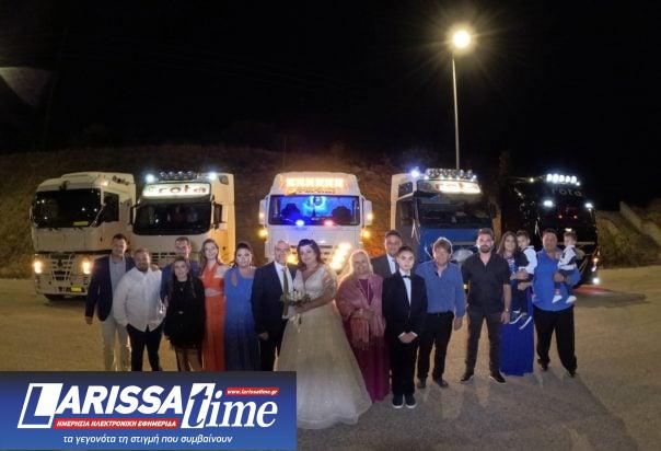 Με ολόφωτες και… «φασαριόζικες» νταλίκες επέλεξε ένα ζευγάρι στην Αγιά Λάρισας να συνοδεύσει τον γάμο του, πριν από μερικές εβδομάδες.