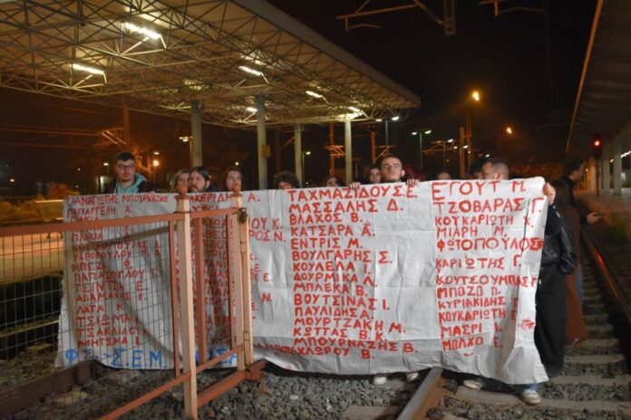 Οι σιδηροδρομικές γραμμές μπροστά από τον Σταθμό του ΟΣΕ στη Λάρισα παρέμειναν κλειστές το βράδυ του Σαββάτου, καθώς φοιτητές της πόλης προχώρησαν σε συμβολικό αποκλεισμό στη μνήμη των 57 θυμάτων της τραγωδίας των Τεμπών.