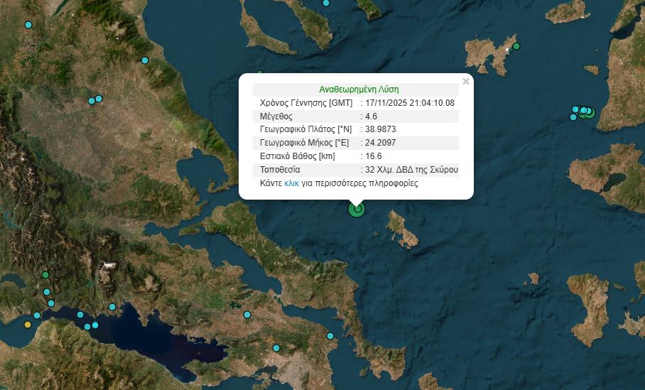 Σεισμός 4,6 βαθμών της κλίμακας Ρίχτερ σημειώθηκε το βράδυ της Δευτέρας (17/11) στη θαλάσσια περιοχή ανοικτά της Σκύρου, με την δόνηση να γίνεται αισθητή και στην Αττική.