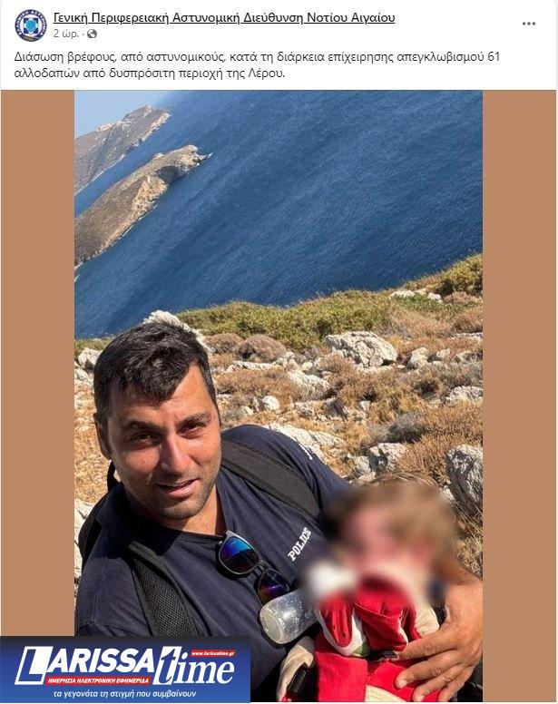 Μάλιστα, όπως ενημερώνει η Γενική Περιφερειακή Αστυνομική Διεύθυνση Νοτίου Αιγαίου μέσω ανάρτησής της στο Facebook δημοσιεύοντας και σχετική φωτογραφία, ανάμεσα στους διασωθέντες, βρισκόταν και ένα βρέφος.