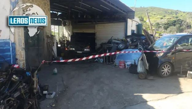 Δείτε εικόνες της ιστοσελίδας lerosnews.gr από το συνεργείο του θύματος, όπου τελέστηκε το έγκλημα. Οι αρχές έχουν βάλει μία κόκκινη κορδέλα στον χώρο.
