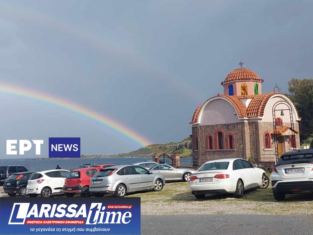 Οι καιρικές συνθήκες βοήθησαν να «γεννηθεί» ένα διπλό ουράνιο τόξο στον ουράνιο θόλο και το οποίο έσπευσαν να φωτογραφίσουν μικροί και μεγάλοι λίγο πριν χαθεί.