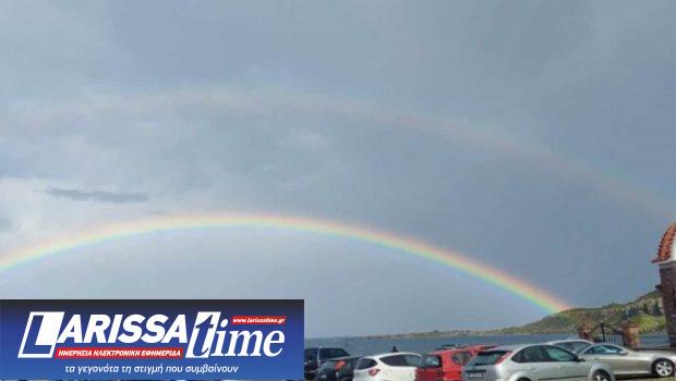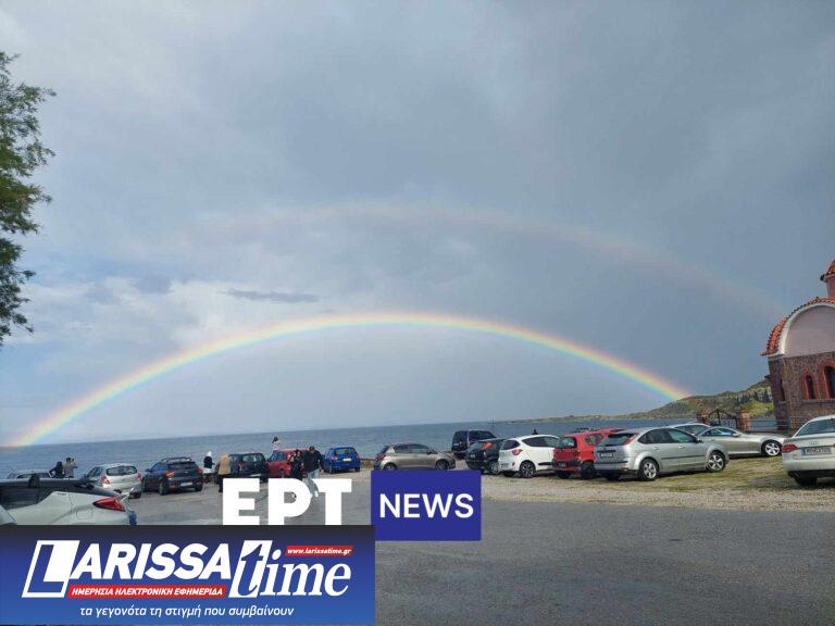 Οι καιρικές συνθήκες βοήθησαν να «γεννηθεί» ένα διπλό ουράνιο τόξο στον ουράνιο θόλο και το οποίο έσπευσαν να φωτογραφίσουν μικροί και μεγάλοι λίγο πριν χαθεί.