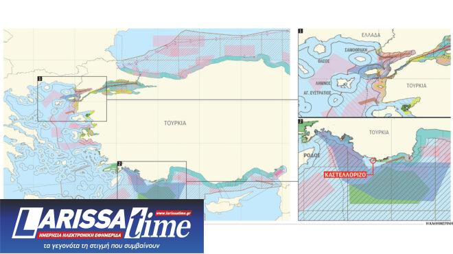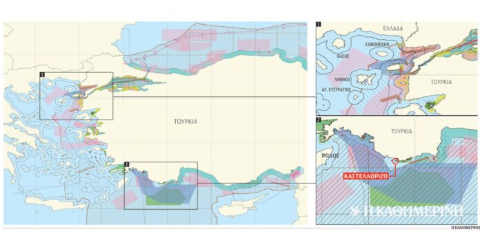 (β) Την περιοχή του συμπλέγματος του Καστελλορίζου που ο τουρκικός χάρτης του 2020 προς τον ΟΗΕ είχε ήδη εξαφανίσει.