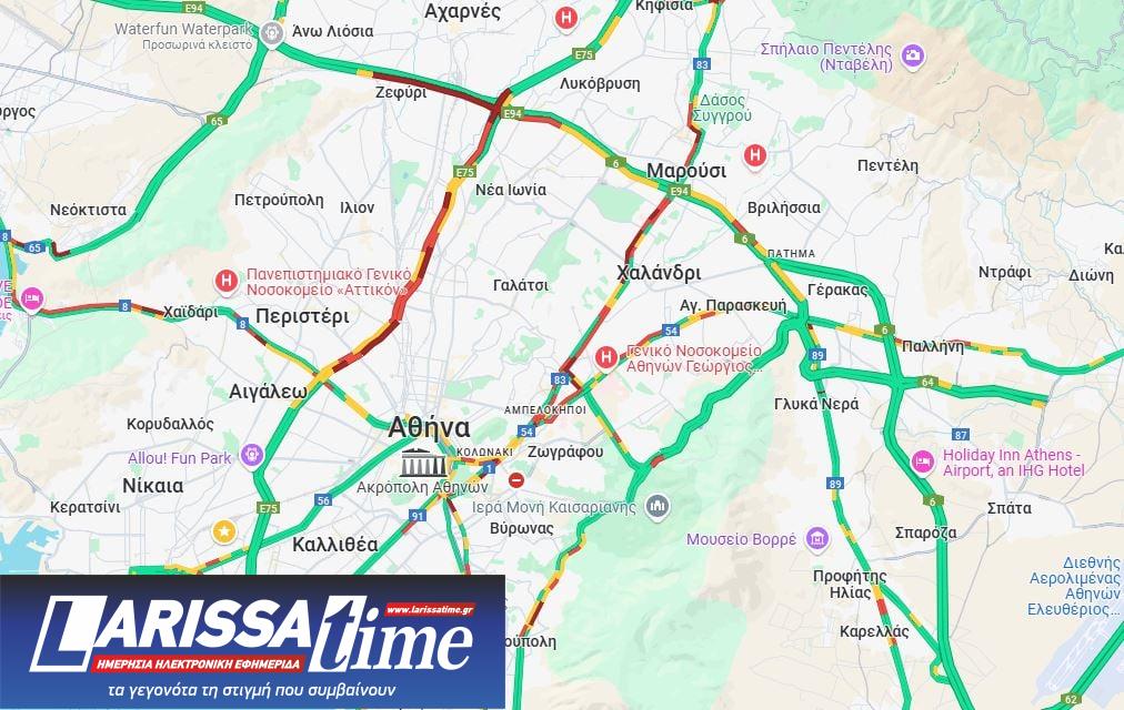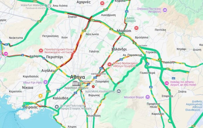«Κόκκινο ποτάμι» και ο Κηφισός ειδικά στην άνοδο, ενώ προβλήματα παρουσιάζονται στην Λεωφόρο Αλεξάνδρας αλλά και στην Λεωφόρο Βουλιαγμένης λόγω εργασιών που πραγματοποιούνται.