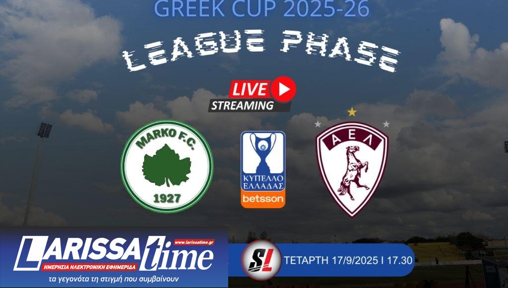 Παρακολουθήστε LIVE με βίντεο και ήχο από το soccerlive την Τετάρτη (17/09) και ώρα 17:30 την εξέλιξη της αναμέτρησης Μαρκό-ΑΕΛ, που θα διεξαχθεί στο Δημοτικό Στάδιο Καρδίτσας, στο πλαίσιο της 1ης αγωνιστικής της League Phase του Κυπέλλου Ελλάδας.