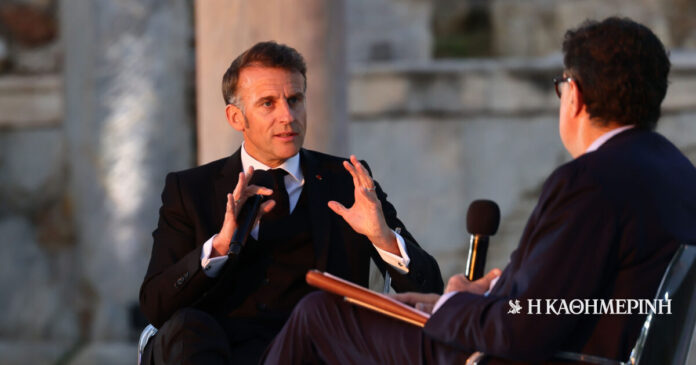 Σε ερώτηση του Αλέξη Παπαχελά για το αν η Ευρώπη εκχωρεί την άμυνά της στις ΗΠΑ, όπως ισχυρίζεται ο Τραμπ, ο Γάλλος πρόεδρος μεταξύ άλλων δήλωσε: «Ας μην υποτιμούμε τη σημασία της στιγμής. Ο Αμερικανός πρόεδρος, ο Ρώσος πρόεδρος, ο Κινέζος πρόεδρος, είναι όλοι κατά της Ευρώπης. Είναι ένα “καμπανάκι”. Ας αποκτήσουμε αυτοπεποίθηση στην Ευρώπη. Για την Ουκρανία διαφωνώ. Οταν ξεκίνησε ο πόλεμος πολλοί αμφισβητούσαν τη δυνατότητά μας να αντιδράσουμε. Ομως, από την πρώτη ημέρα θεσπίσαμε κυρώσεις σε βάρος της Ρωσίας. Και η Ρωσία υποφέρει. Από την πρώτη ημέρα τα κάναμε αυτά. Εχουμε επιβάλει 20 πακέτα κυρώσεων έκτοτε. Εχουμε μία πυρηνική δύναμη κοντά στα σύνορά μας. Είμαστε ο υπ’ αριθμόν 1 επενδυτής, η Ουκρανία αμύνεται πολύ πιο αποτελεσματικά από ό,τι περίμεναν. Και για αυτό δεν έχει καταρρεύσει – ανέκτησε μάλιστα και εδάφη».