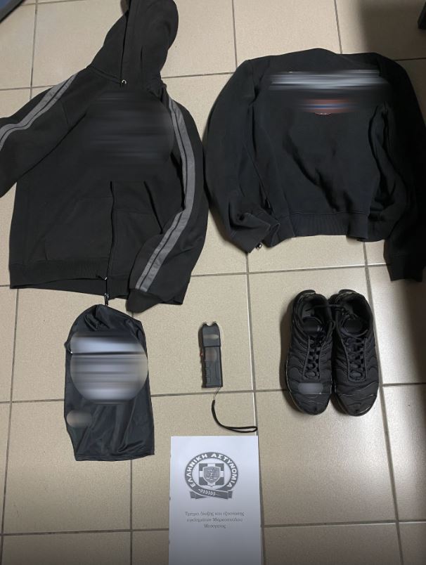 Σε έρευνες που έκαναν οι αστυνομικοί εντόπισαν και κατέσχεσαν την συσκευή ηλεκτρικής εκκένωσης, τα ρούχα που φορούσε για τη διάπραξη της ληστείας, 33 φυσίγγια, γεμιστήρα, σπρέι πιπεριού και μικροποσότητα κάνναβης.