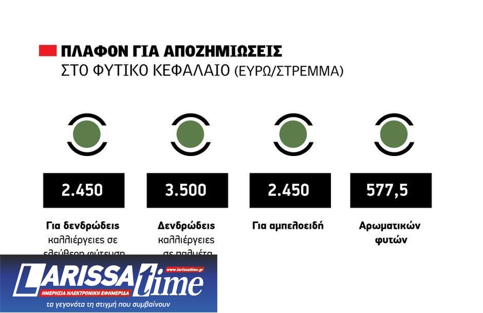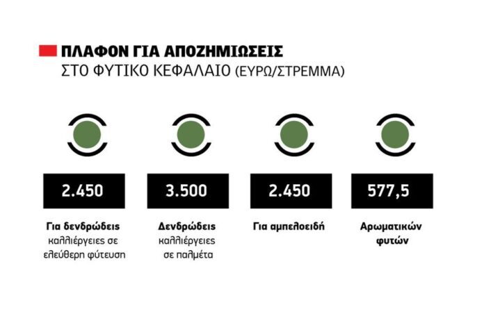 Υπενθυμίζεται πως το πλαφόν αποζημίωσης για απώλειες σε φυτικά μέσα παραγωγής διαμορφώνεται κατ’ ανώτατο όριο ανά στρέμμα και είδος φύτευσης, για τους κατ’ επάγγελμα αγρότες, ως εξής: