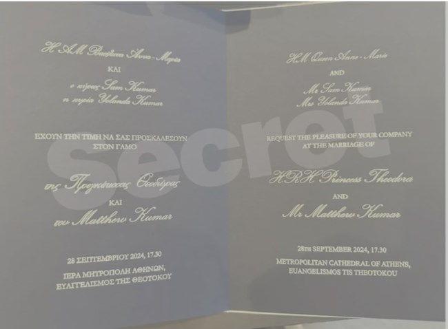 “Η Α.Μ. Βασίλισσα Αννα-Μαρία και ο κύριος Σαμ Κουμάρ / η κυρία Γιολάντα Κουμάρ έχουν την τιμή να σας προσκαλέσουν στον γάμο της Πριγκίπισσας Θεοδώρας και του Μάθιου Κουμάρ / 28 Σεπτεμβρίου 2024, 17.30 / Ιερά Μητρόπολη Αθηνών, Ευαγγελισμός της Θεοτόκου”.